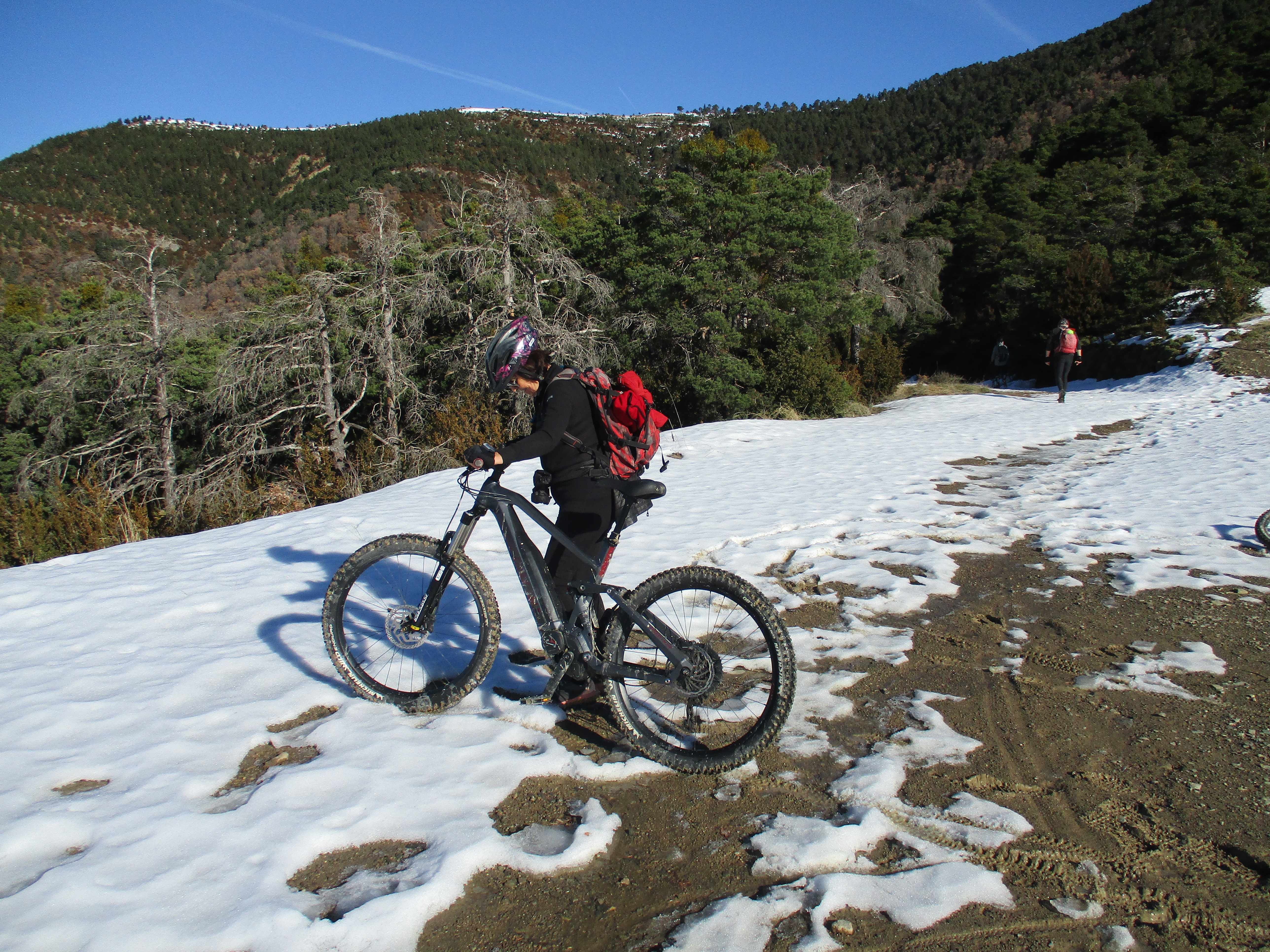 Partis pour faire la boucle n°6 des itinéraires Jaca Bikeland ( https://jacapirineosbikeland.com/ ), les conditions d’enneigement, nous ont fait rabattre sur la boucle n°7 par peur de trouver un niveau neigeux trop conséquent dans la descente en versant Nord depuis Bergosa. Nous sommes partis du parking de tourisme au Nord de la citadelle, idéal pour se garer. On y accède en venant de France en empruntant la rue centrale, puis en tournant à droite la "Callé del Monte Albarin", après le rond-point le parking est en face. Nous sommes partis par la "callé del Pico Collorada" pour rejoindre la route partant vers la France(km 0.7) au niveau de l’École Militaire de Haute Montagne.on la suit pour prendre à droite la "callé Favorita"(km 1.1) et rejoindre en suivant le fléchage, passer deux ronds points, le centre commercial. On le laisse à droite(km 2.7) pour suivre une piste d'abord, tout droit, puis elle serpente pour rejoindre l'asphalte(km 4.8) conduisant à Ipas. On traverse le village(km 5.2) pour rejoindre la piste(km 5.4) montant vers "La Peña de Castillon". On rejoint par une piste raide, avec parfois de forts pourcentages, et aujourd'hui des plaques de neige, un vague col à la cote 1225(km 7.5), carrefour de piste. Nous aurions dû partir par la piste plein Nord rejoignant Bergosa, mais vu les conditions, nous avons décidé de suivre l’itinéraire n°7 par un sentier partant vers l'Ouest vers la "Selva de Jaca". Au début enneigé, il devient très vite roulable, et de plus très roulant. Très agréable moment sur ce monotrace, on le suit sans ce poser de questions, en admirant le travail des sangliers, très actifs dans la région. On rejoint ainsi la route repartant vers la France(km 11.7). On la suit vers Jaca pour rejoindre très vite le pont de "Las Grallas"(km 11.9). On suit à droite la piste en poursuivant les boucles n°4, 5, 7. Au troisième virage(km 13.8), on laissera partir l'originale de cette dernière à droite, pour en suivre la partie terminale conduisant à la sortie de la conduite forcée de la centrale électrique. Juste avant cet endroit, on trouve à gauche l'amorce d'un monotrace(km 14.4), un peu acrobatique au début (j'ai subi), puis très roulant et ludique. on rejoint la route(km 15,4) menant à la centrale. On la suit vers la droite, on évite l'ouvrage hydroélectrique par la droite, pour suivre un sentier très amusant, et aménagé conduisant à la route(km 16.8) menant à Asiéso. On monte vers le village et au dernier virage(km 17.3) avant agglomération, on suit une sente à gauche très boueuse ce jour ci vers la fin, qui nous conduit au très joli pont de San Miguel (évident). Après le pont on rejoint Jaca par le goudron et le parking en suivant le fléchage.